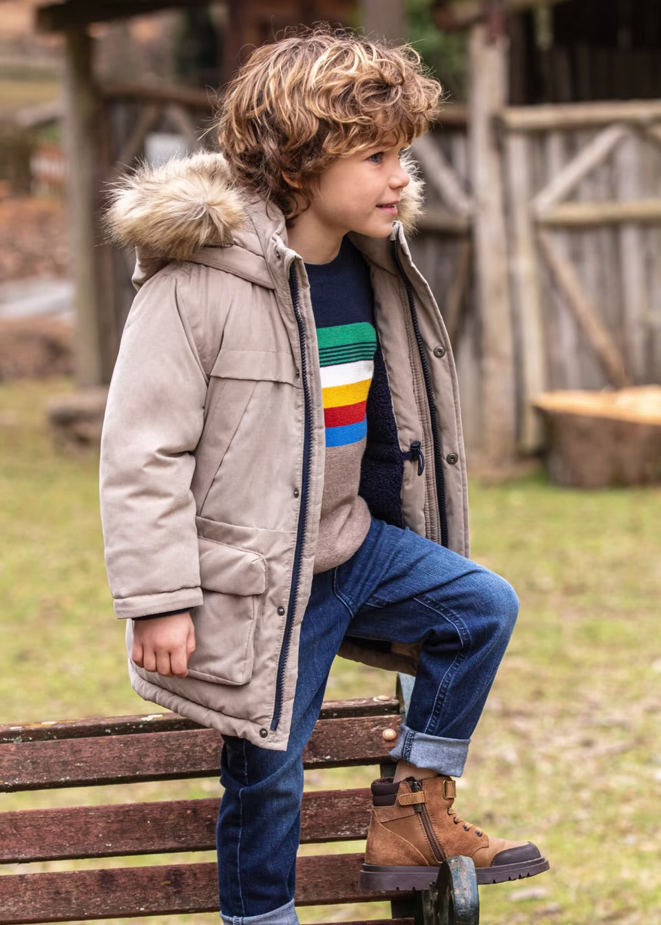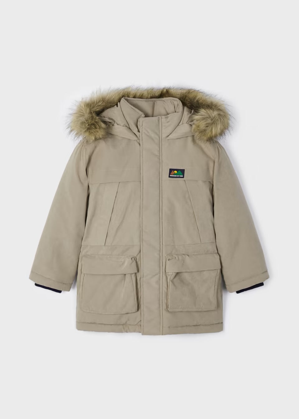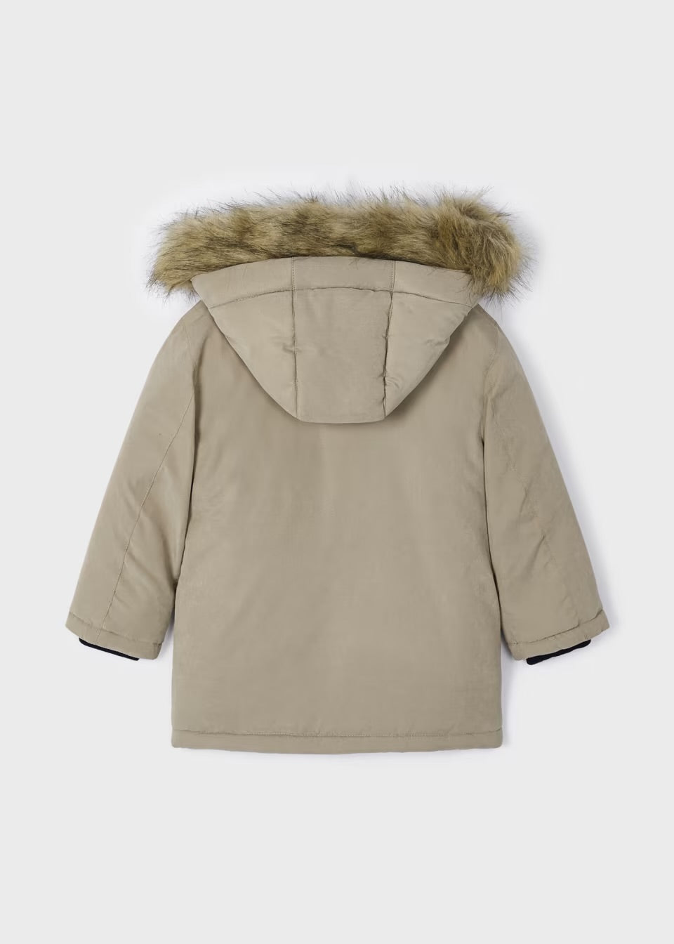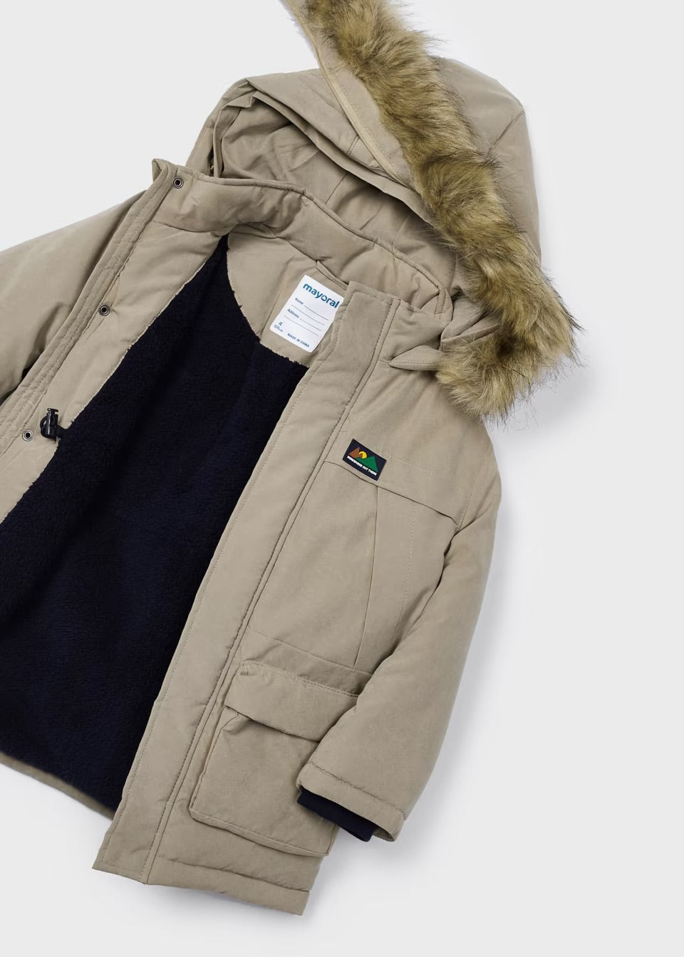 Este es un abrigo tipo parka para niño, en color beige claro, con capucha adornada con borde de peluche. Cuenta con un cierre frontal de cremallera cubierto por una solapa para mayor protección contra el frío, y dos amplios bolsillos delanteros con solapa.