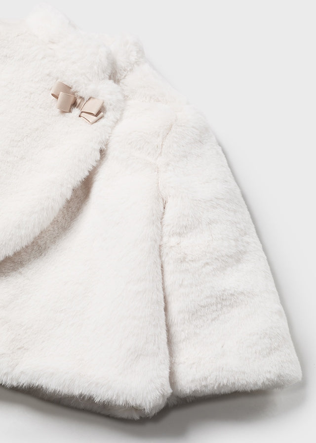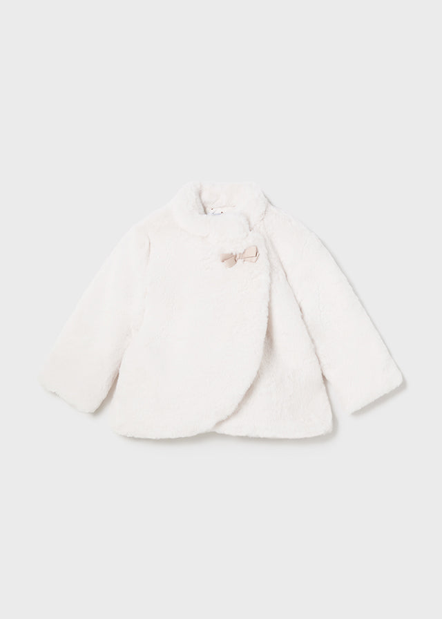 Este encantador abrigo para bebé está confeccionado en un suave material peludo en color crudo, ideal para mantener a tu pequeña abrigada y cómoda durante los días fríos. Presenta un diseño con cuello alto y un cierre asimétrico que le da un toque moderno. Además, está adornado con un pequeño moño en tono beige. Este abrigo es perfecto para complementar cualquier atuendo, ya sea para ocasiones especiales o para el uso diario, brindando un estilo elegante y acogedor.
