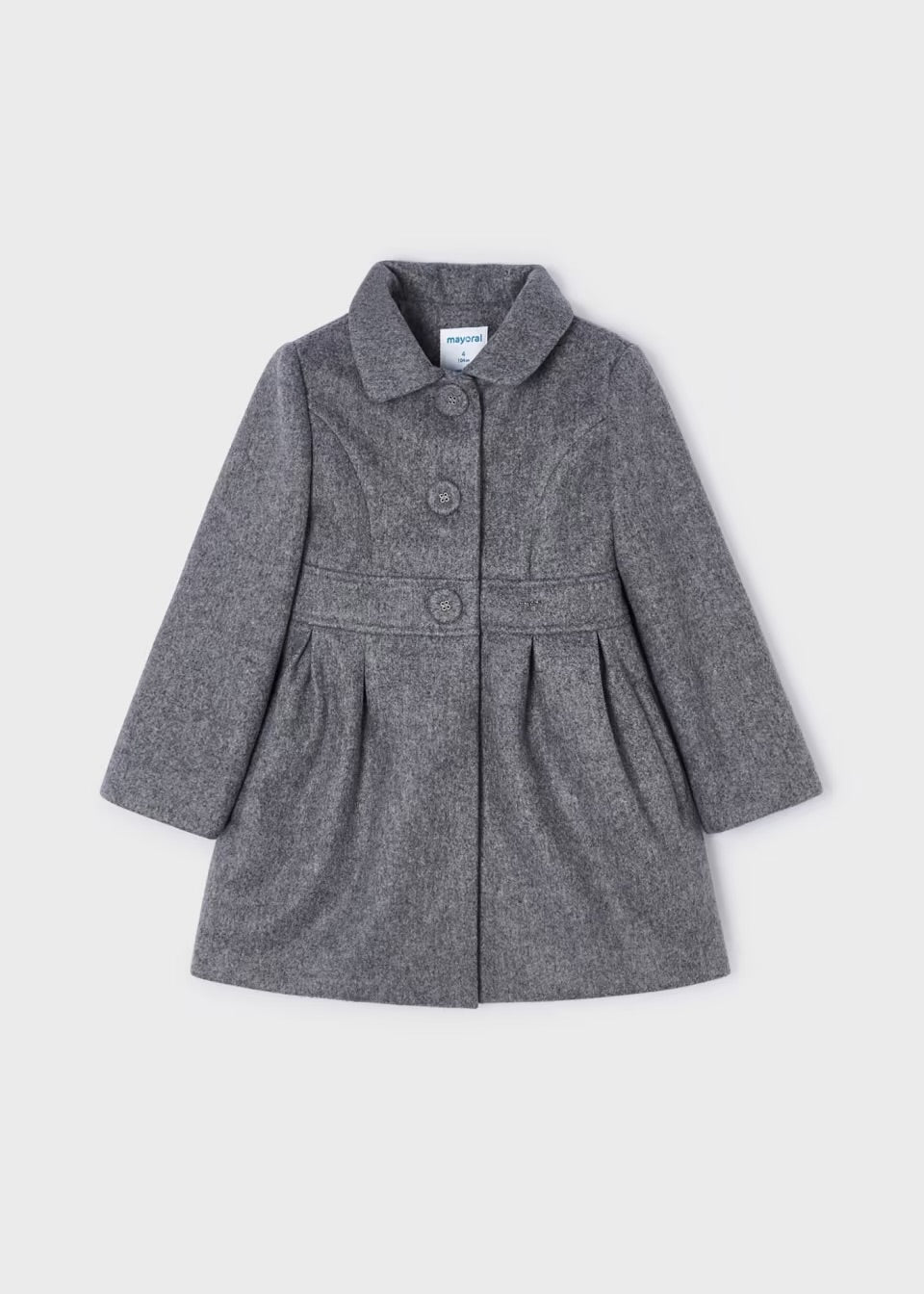 Abrigo para niña en color gris oscuro, de estilo clásico y elegante. Tiene un diseño estructurado con botones en la parte frontal y detalles de pinzas que crean un ligero vuelo en la parte inferior. El cuello redondo y el corte recto lo convierten en una prenda ideal para ocasiones formales.