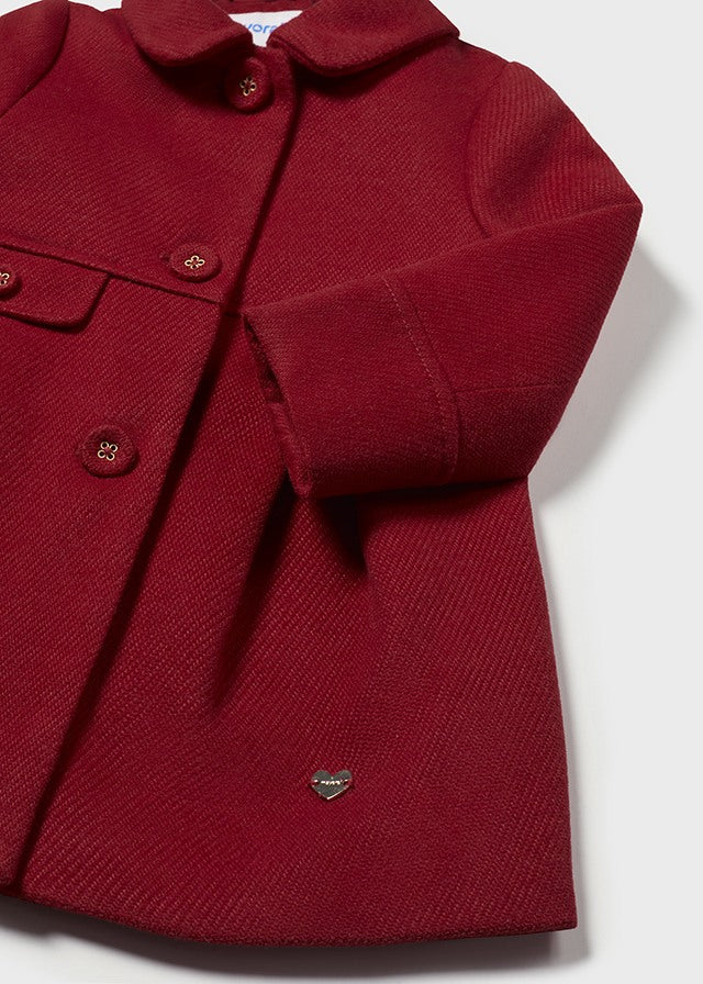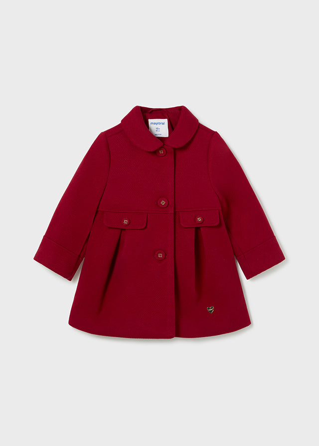 Este sofisticado abrigo para bebé es de un suave tono rojo y está confeccionado en un material cálido y resistente, perfecto para los días más fríos. Presenta un diseño clásico con un cuello redondo, cierre frontal de botones grandes y dos bolsillos decorativos en la parte frontal. El corte del abrigo es ligeramente acampanado, lo que le da un toque de elegancia y permite un movimiento cómodo.