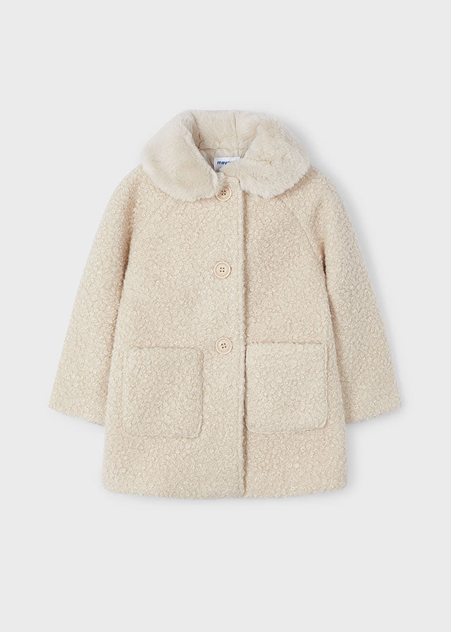 Este abrigo de color almendra presenta un diseño encantador y acogedor. Con un acabado de textura suave y un cuello de pelaje, ofrece un toque elegante. Está equipado con botones frontales y dos amplios bolsillos. Su corte clásico y su calidez lo convierten en una prenda versátil que se puede combinar con una variedad de atuendos, perfecta para dar un toque sofisticado a cualquier look invernal.