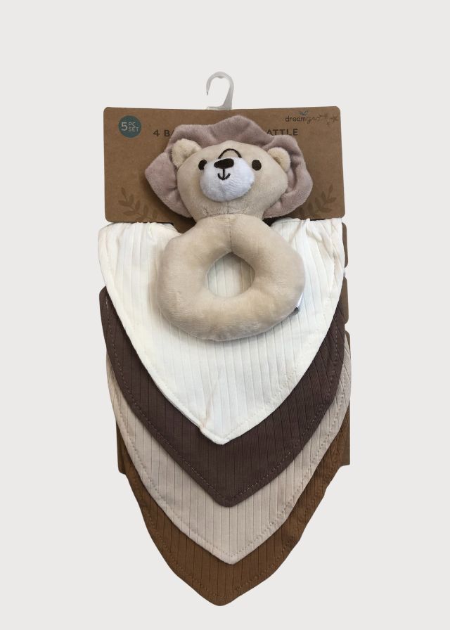 Juego de cuatro baberos para bebé, incluye sonaja de tela con diseño de león