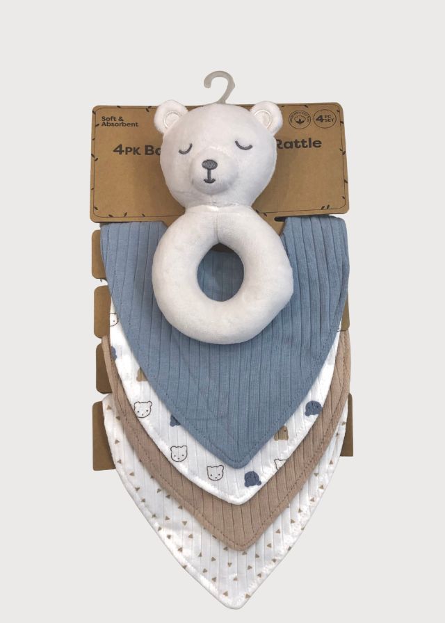 Juego de cuatro baberos para bebé, incluye sonaja de tela con diseño de oso