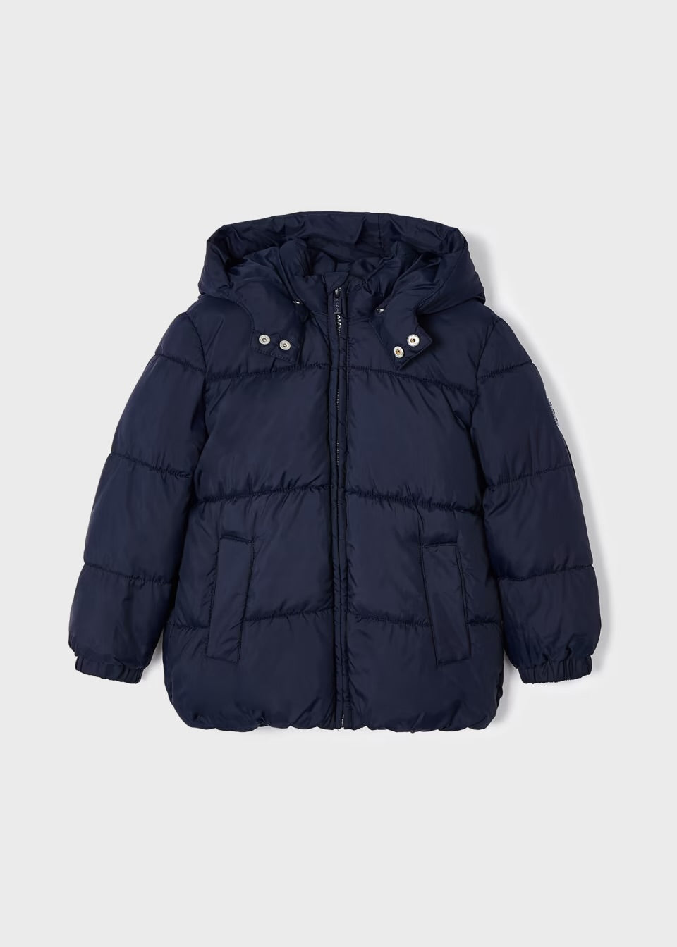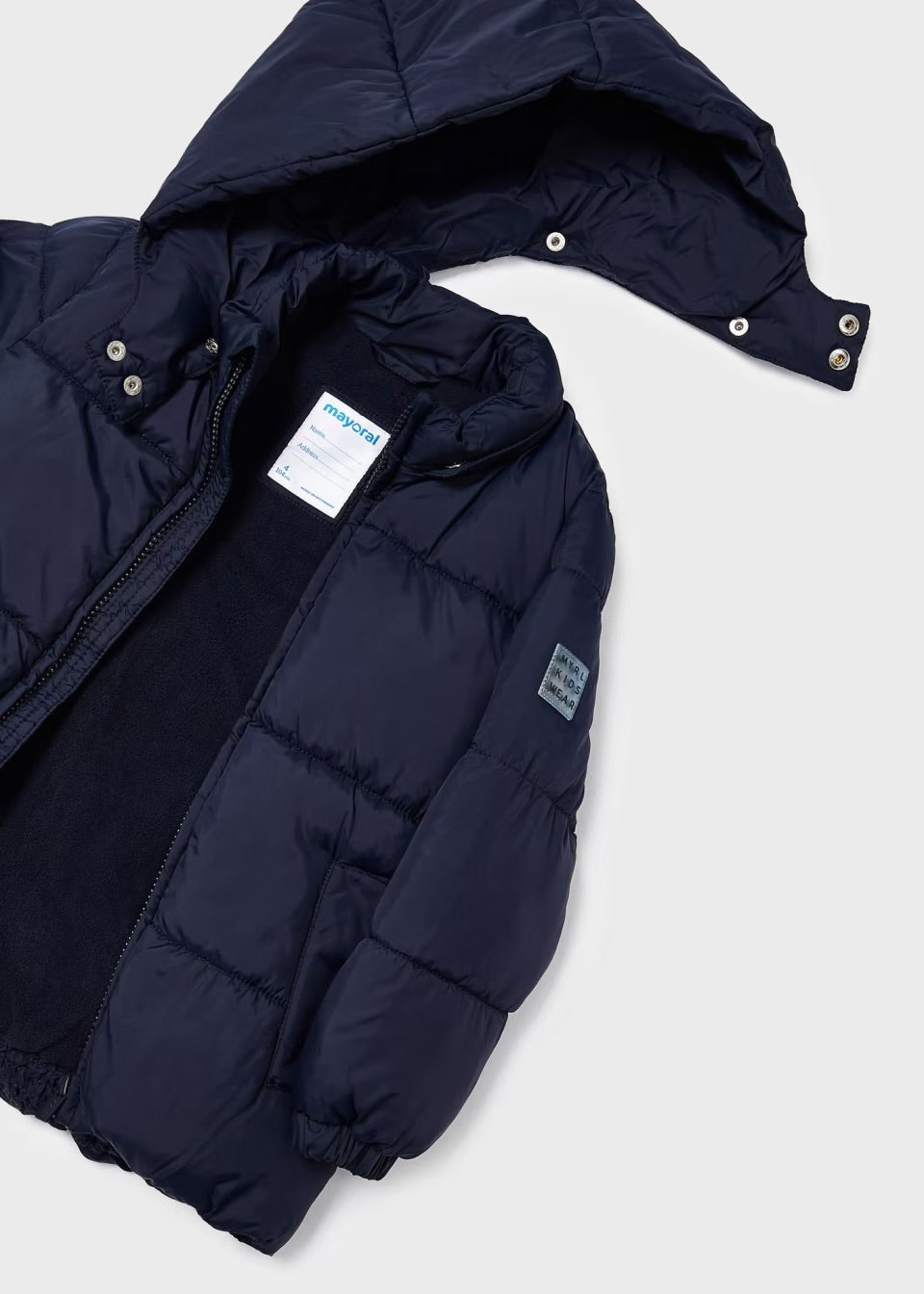 Esta es una chamarra acolchada para niño en color azul marino, diseñado para ofrecer protección contra el frío. Cuenta con una capucha desmontable y un cierre frontal de cremallera cubierto por una solapa con botones a presión para mayor seguridad. El abrigo tiene dos bolsillos laterales con solapas y puños elásticos para un mejor ajuste.