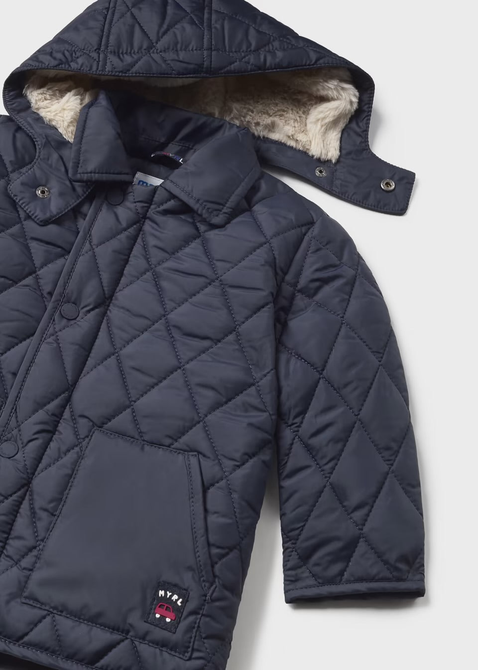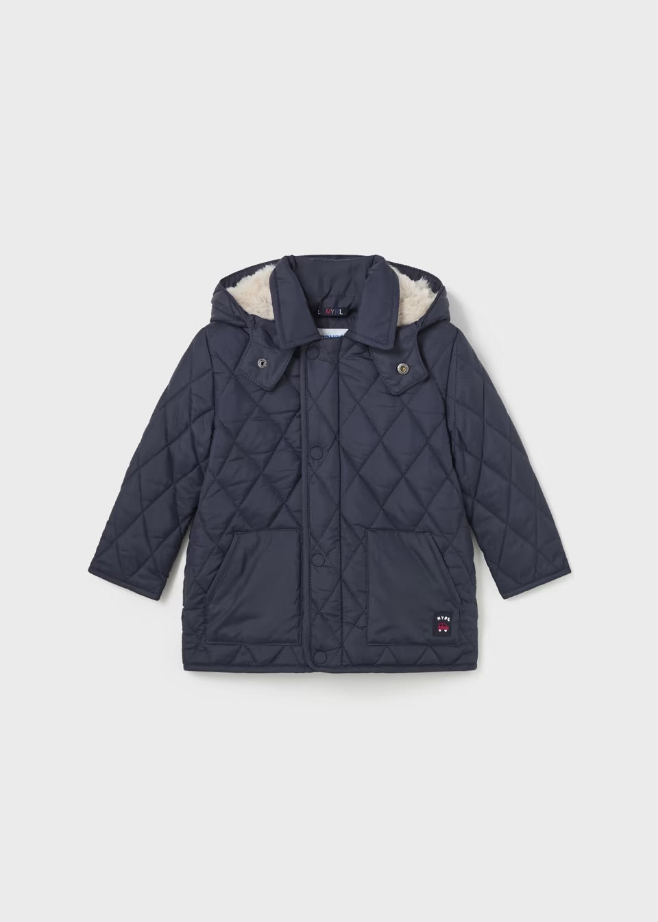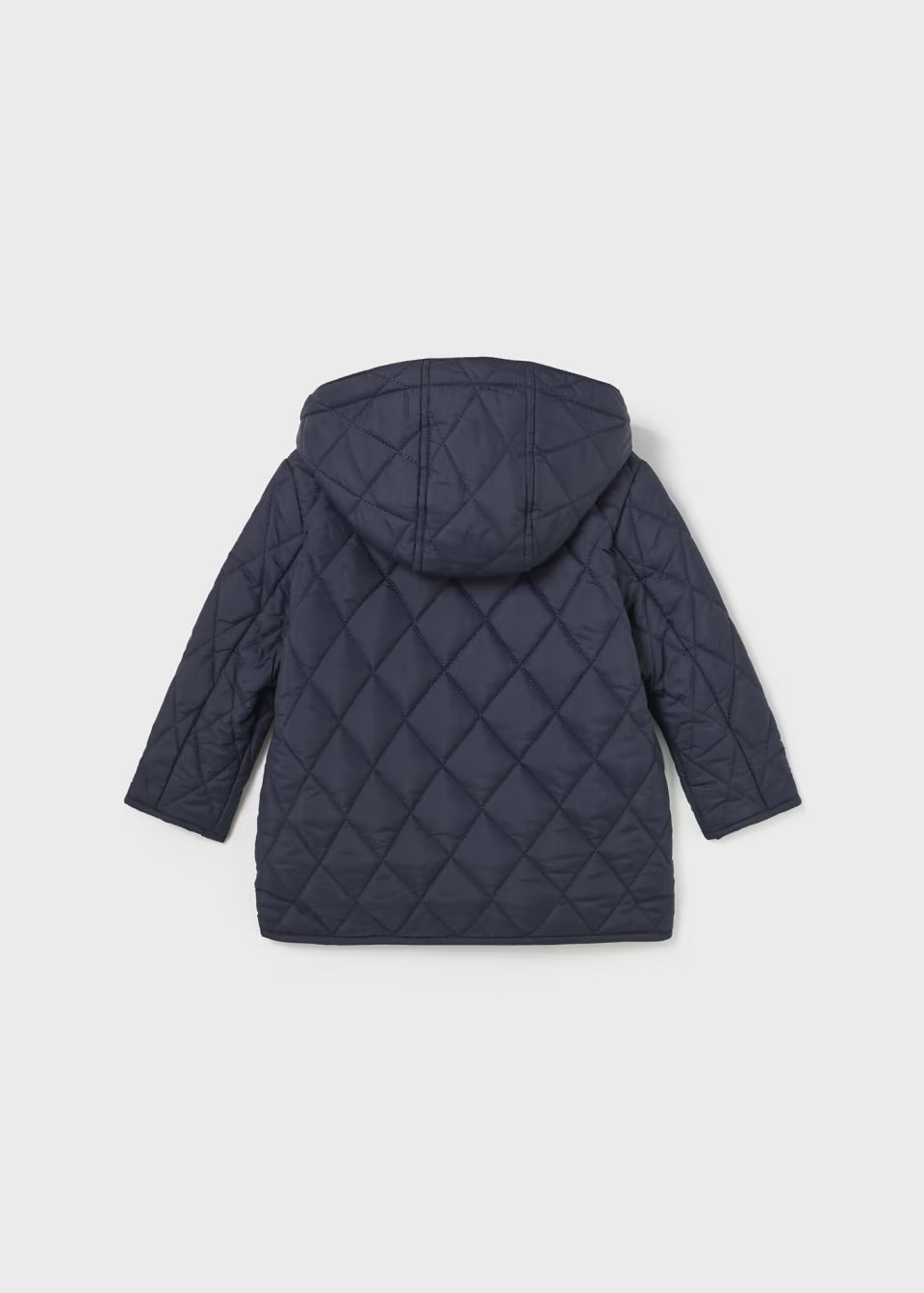 Esta es una chamarra forrada por dentro para niño en color azul marino, con un diseño de rombos que le aporta un estilo clásico y elegante. Incluye una capucha desprendible con forro de peluche en el interior para mayor calidez y confort. Cuenta con botones de presión y bolsillos frontales.