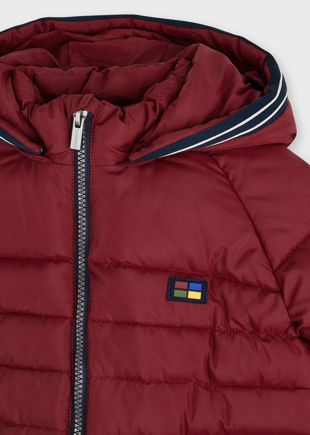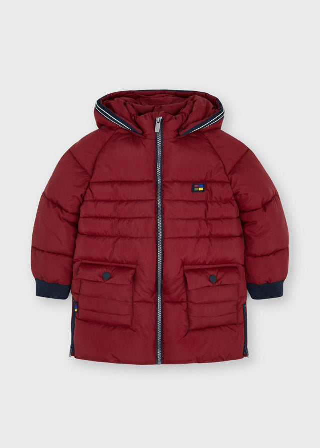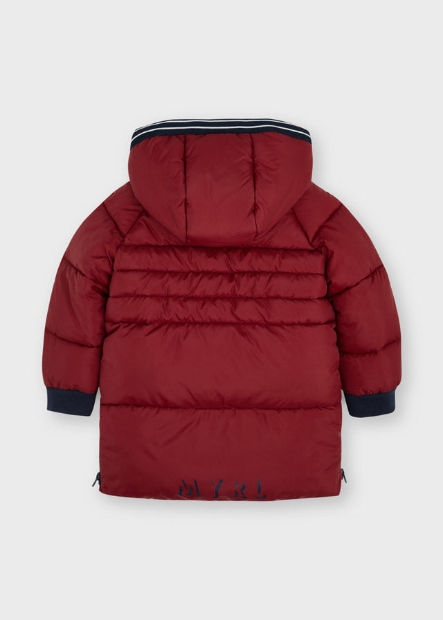 Chamarra larga tipo bomber para niño en color rojo oscuro, acolchado y con capucha. Cuenta con cierre de cremallera, bolsillos delanteros con botón y puños en contraste azul marino.