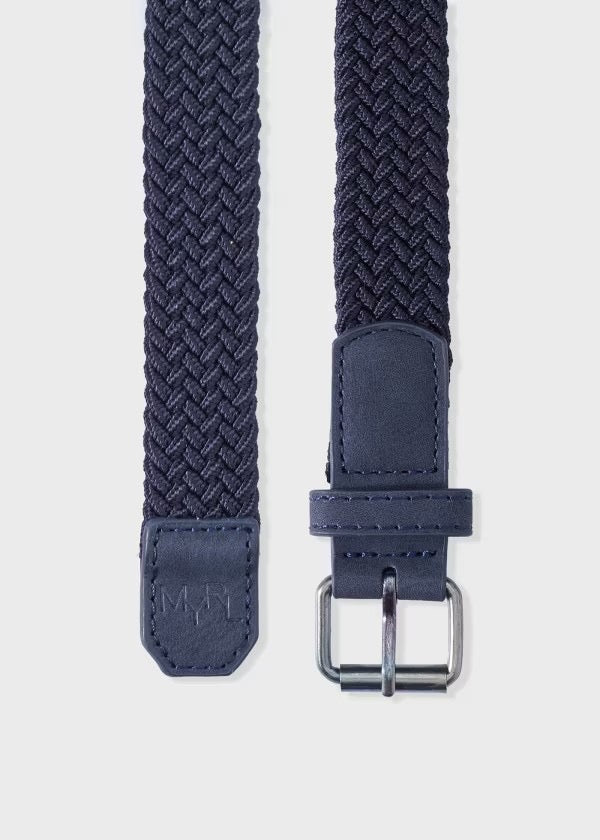 Cinturón tejido marino con hebilla metálica y detalles en cuero sintético. Es ajustable, casual y versátil.