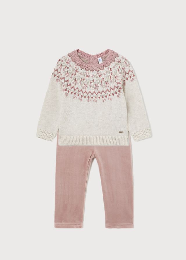 Este conjunto incluye un suéter de color hueso con un bonito diseño en la parte superior en tonos rosa y un par de leggings en color rosa suave. El suéter, con un cuello redondo y un tejido acogedor, presenta un patrón decorativo que añade un toque festivo. Los leggings son cómodos y ajustados.