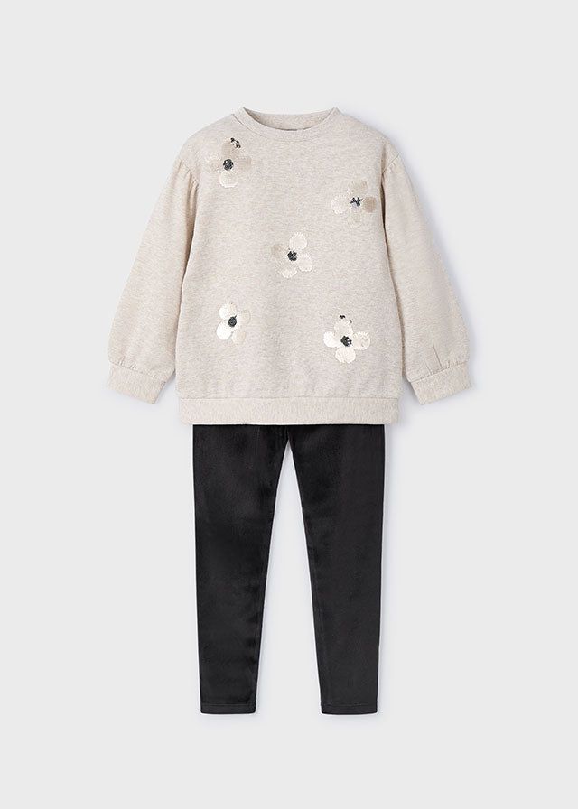 Este conjunto de dos piezas es perfecto para un look cómodo. La parte superior es una sudadera de color caqui claro, adornada con flores de lentejuela reversibles. Las mangas son ligeramente abullonadas, aportando un estilo moderno y delicado.