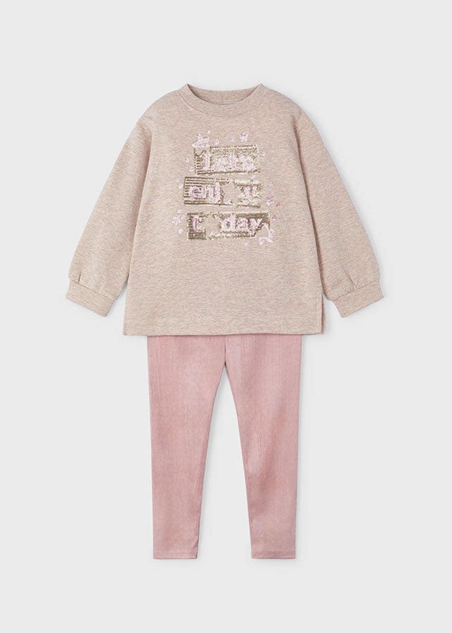 Este conjunto de dos piezas presenta un estilo cómodo. La parte superior es una sudadera de tono beige claro con un diseño de lentejuelas en el frente, que agrega un toque brillante y divertido al conjunto. Las mangas largas y ligeramente amplias ofrecen comodidad y facilidad de movimiento.