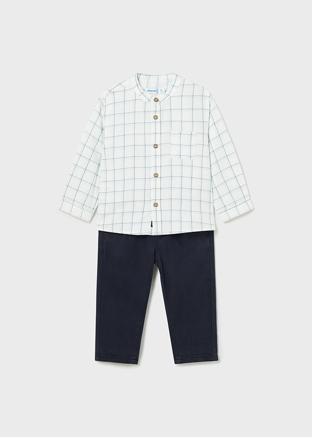 Este conjunto para niños combina estilo y comodidad. La camisa, de manga larga y diseño a cuadros en tonos blancos y verdes, tiene un cuello redondo y botones en la parte delantera.