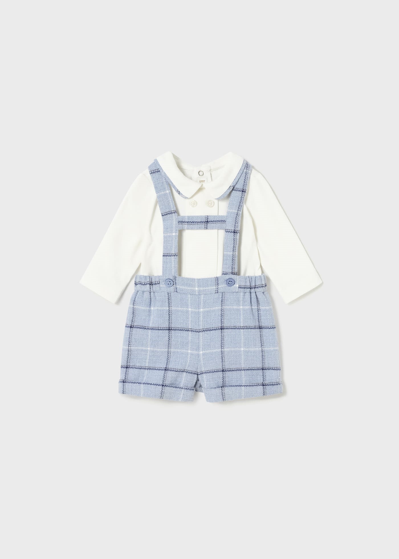 Este es un conjunto para bebé que incluye un pañalero blanco de manga larga con cuello redondo y un pantalón corto de tirantes en tela a cuadros en tonos azul claro y blanco. El diseño es elegante y clásico, con detalles de botones decorativos en la parte delantera de los tirantes.