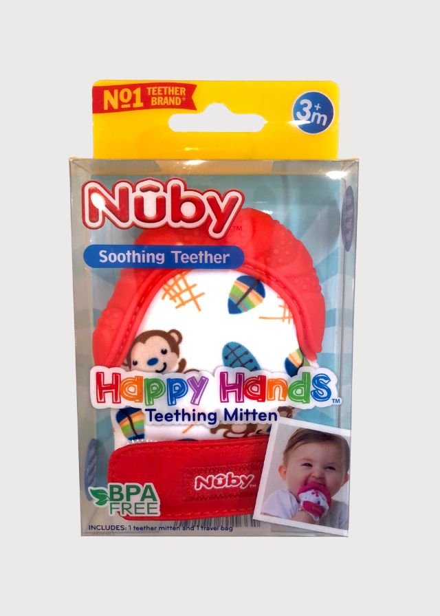 Está diseñado para bebés de 3 meses en adelante. Su función es ayudar a calmar las molestias de la dentición, ya que la parte superior tiene una superficie de silicona suave y texturizada para que el bebé la mastique y alivie el dolor de encías. Además, evita que el bebé se lastime al morderse las manos directamente.