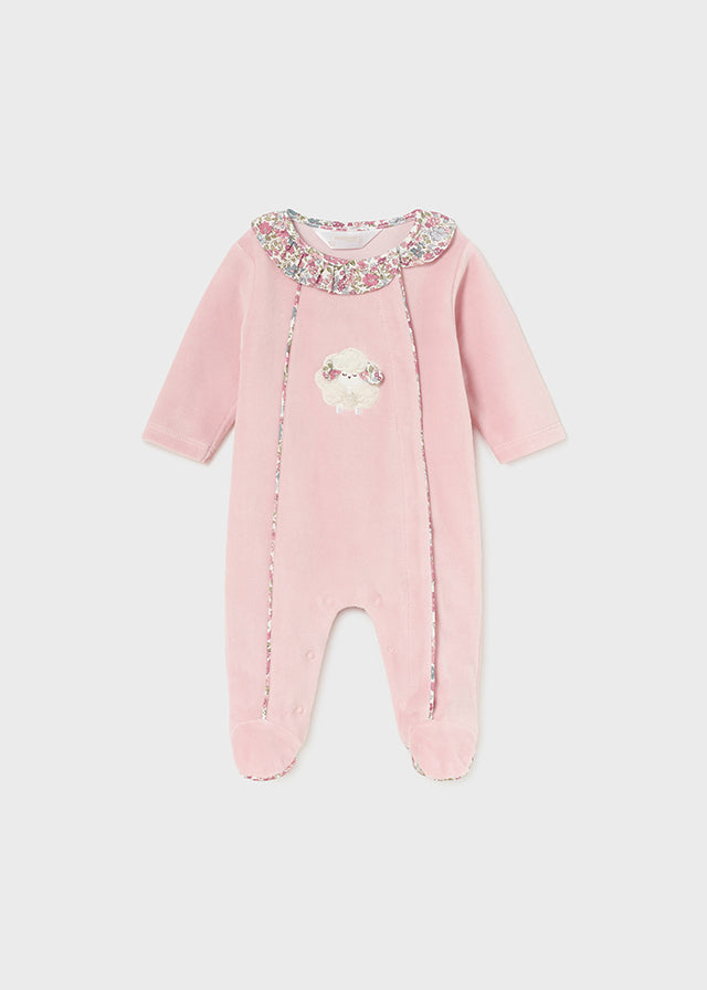 Mameluco para bebé de un suave color rosa. Presenta un encantador cuello con un estampado floral que contrasta con el cuerpo del mameluco. En el centro, hay un bordado de una ovejita que añade un toque tierno. Los pies cubiertos garantizan que tu pequeño se mantenga abrigado, y los botones en la parte inferior facilitan el cambio de pañales. Ideal para mantener a tu bebé cómodo y con estilo en cualquier ocasión.