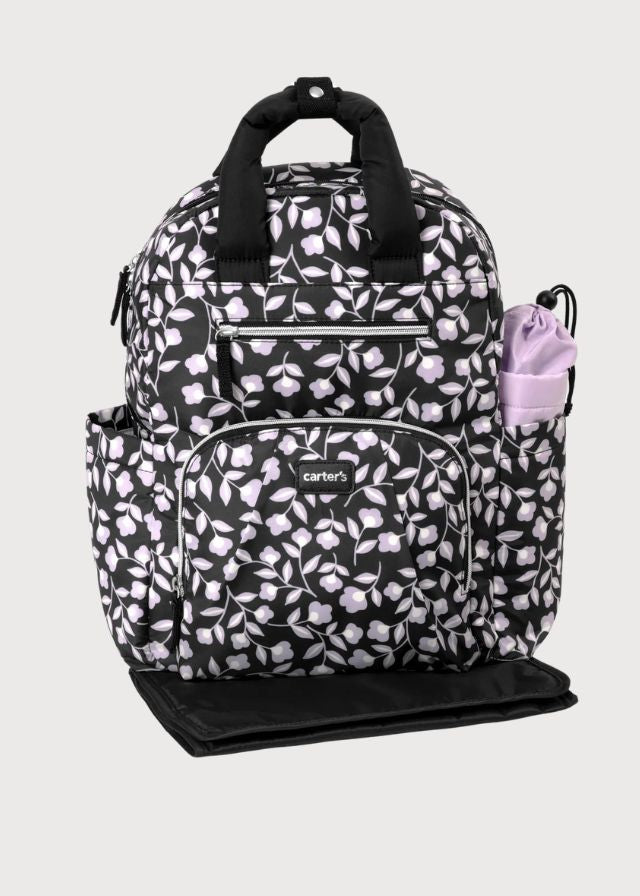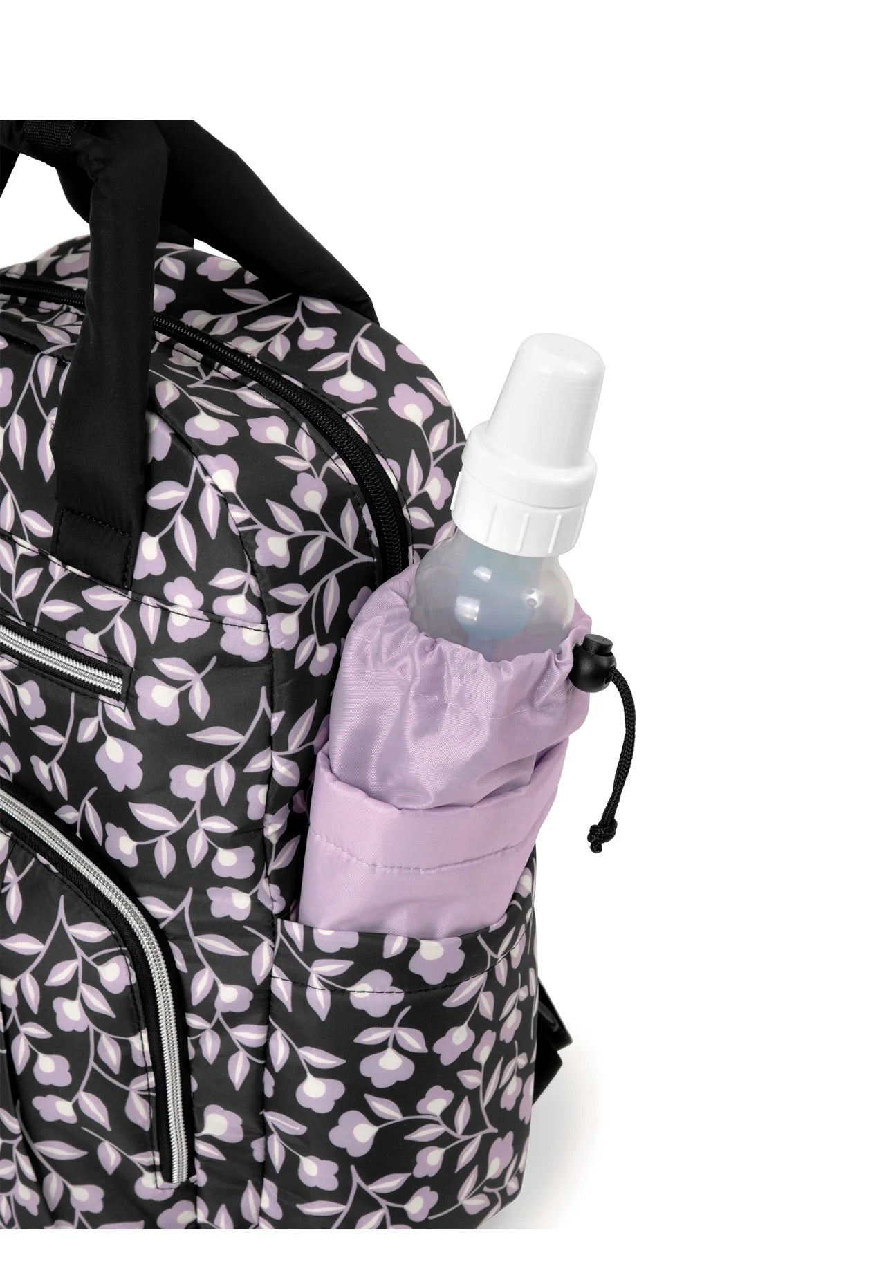 Cuenta con 9 compartimentos, bolsa para biberones de cierre con cordón, interior espacioso, cambiador lavable, asas para carriola.