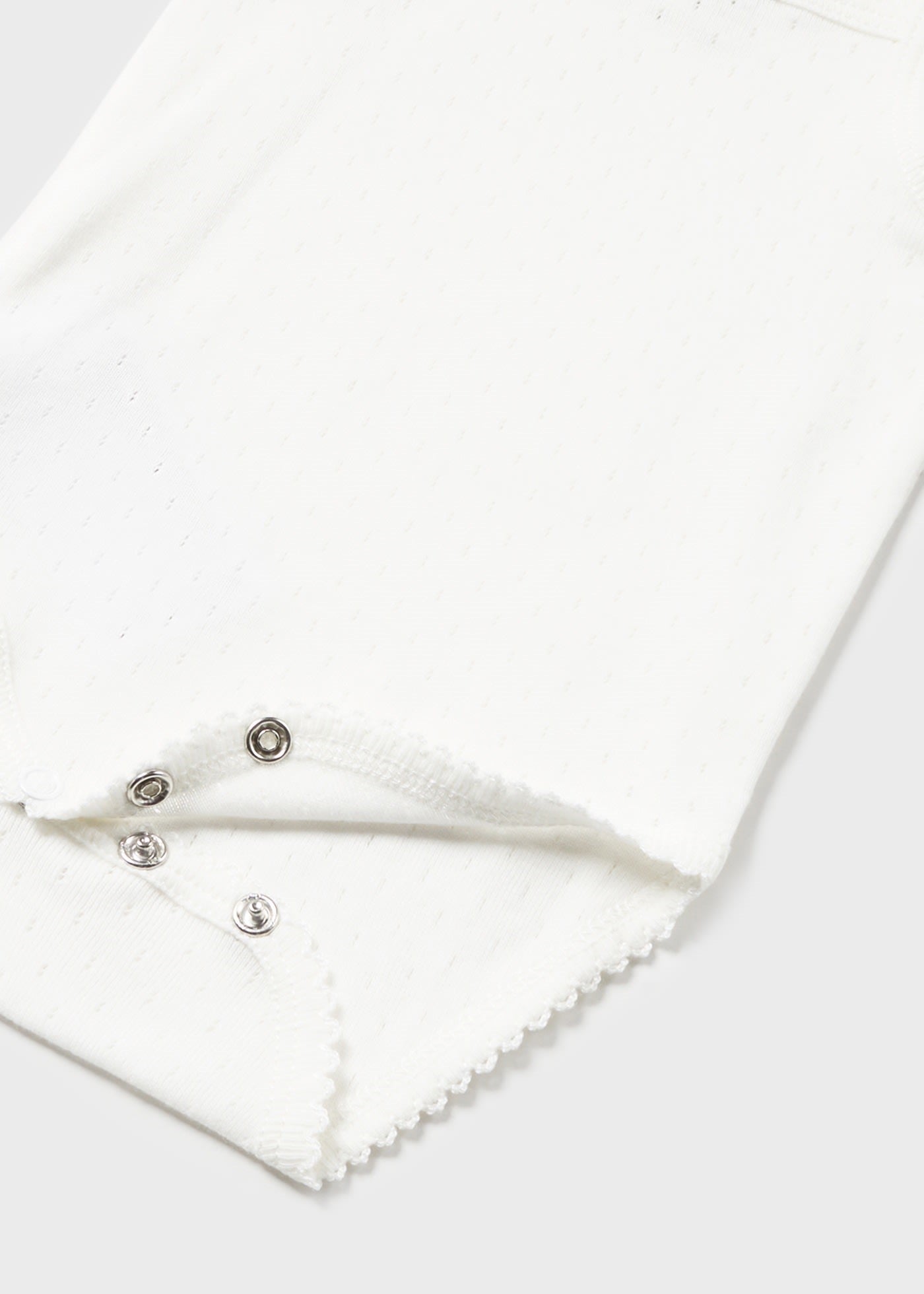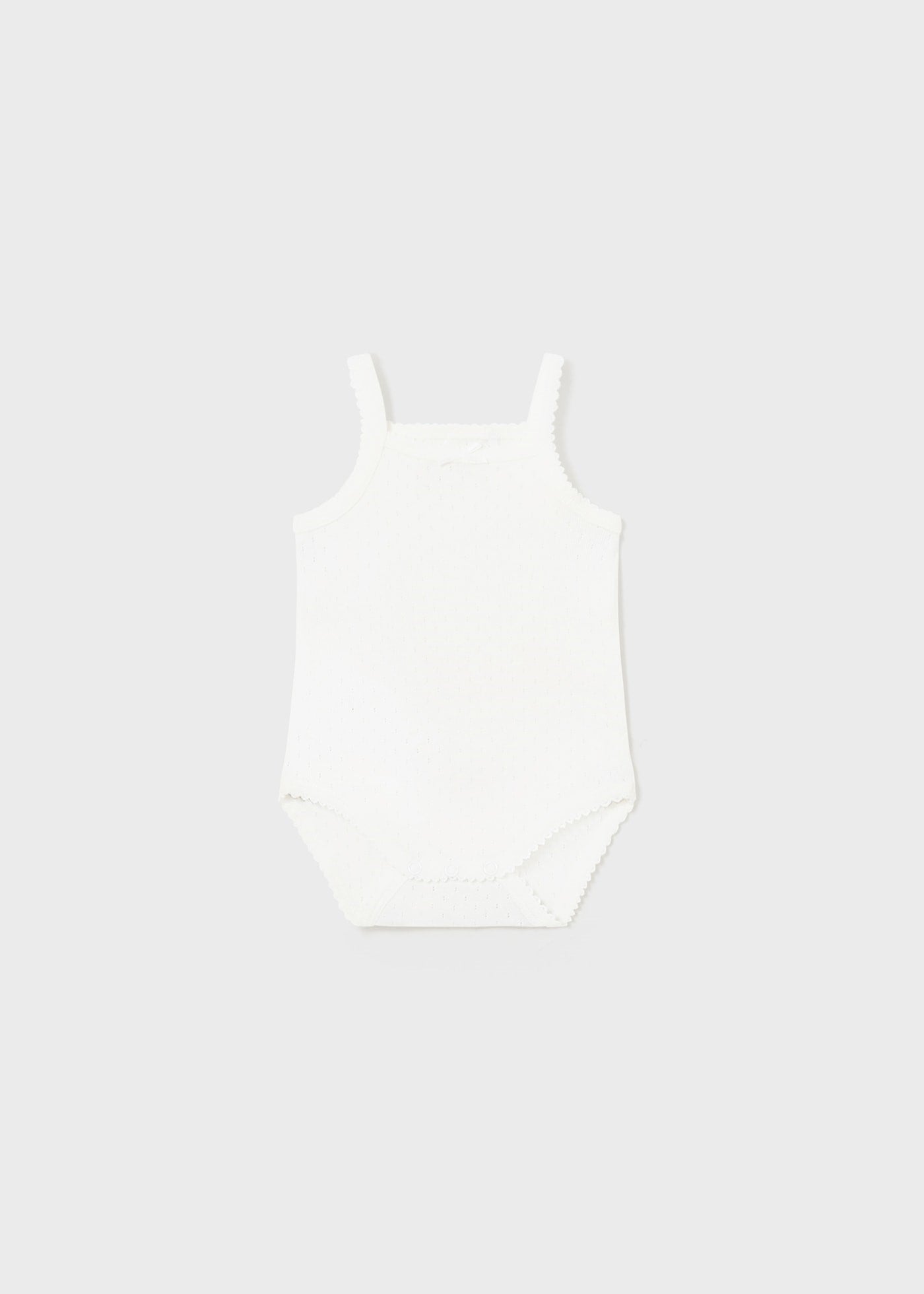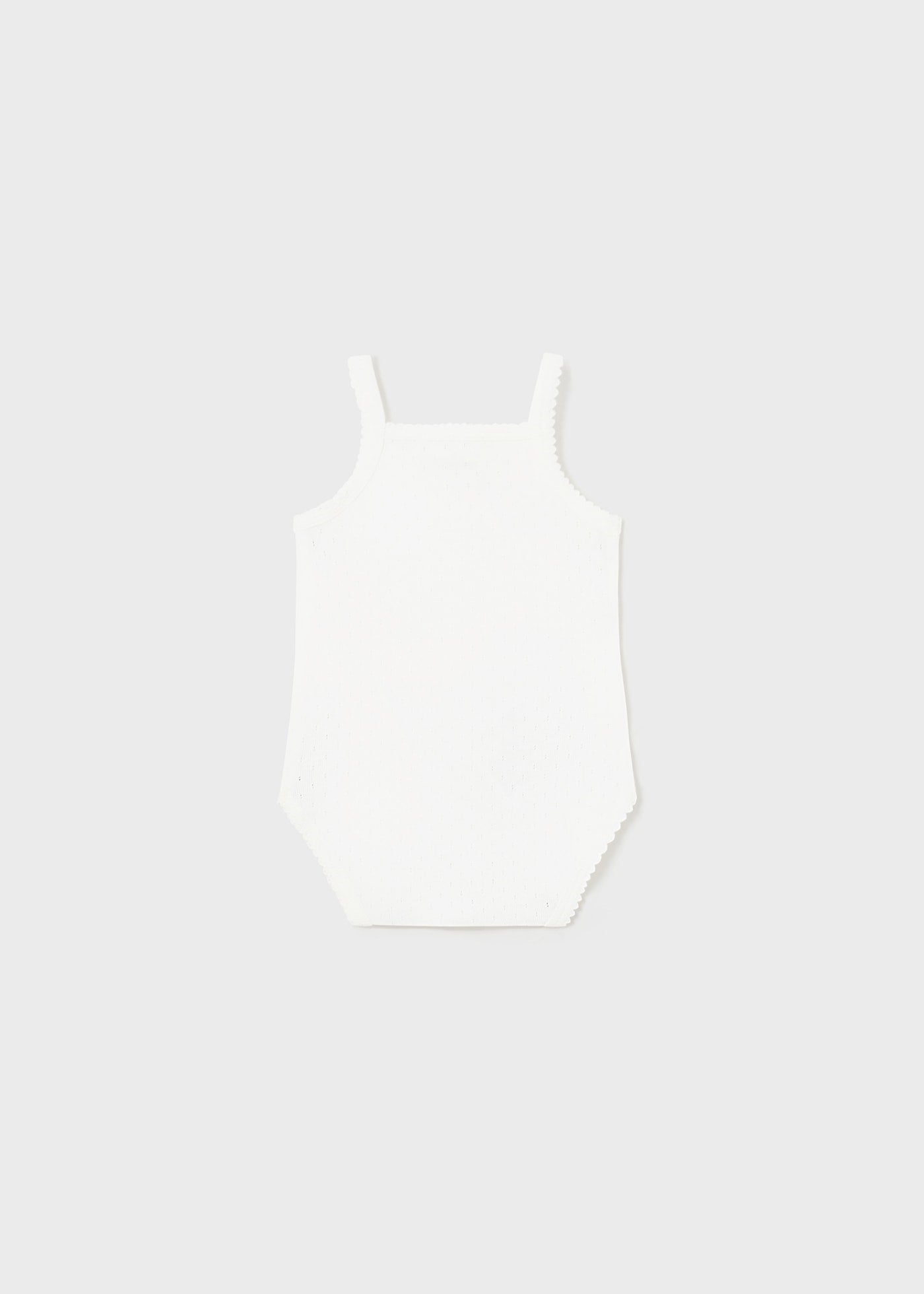 Este es un body para bebé de tirantes en color blanco, con detalles delicados en el borde del escote, las sisas y la parte inferior. Es ideal para usar como prenda básica.