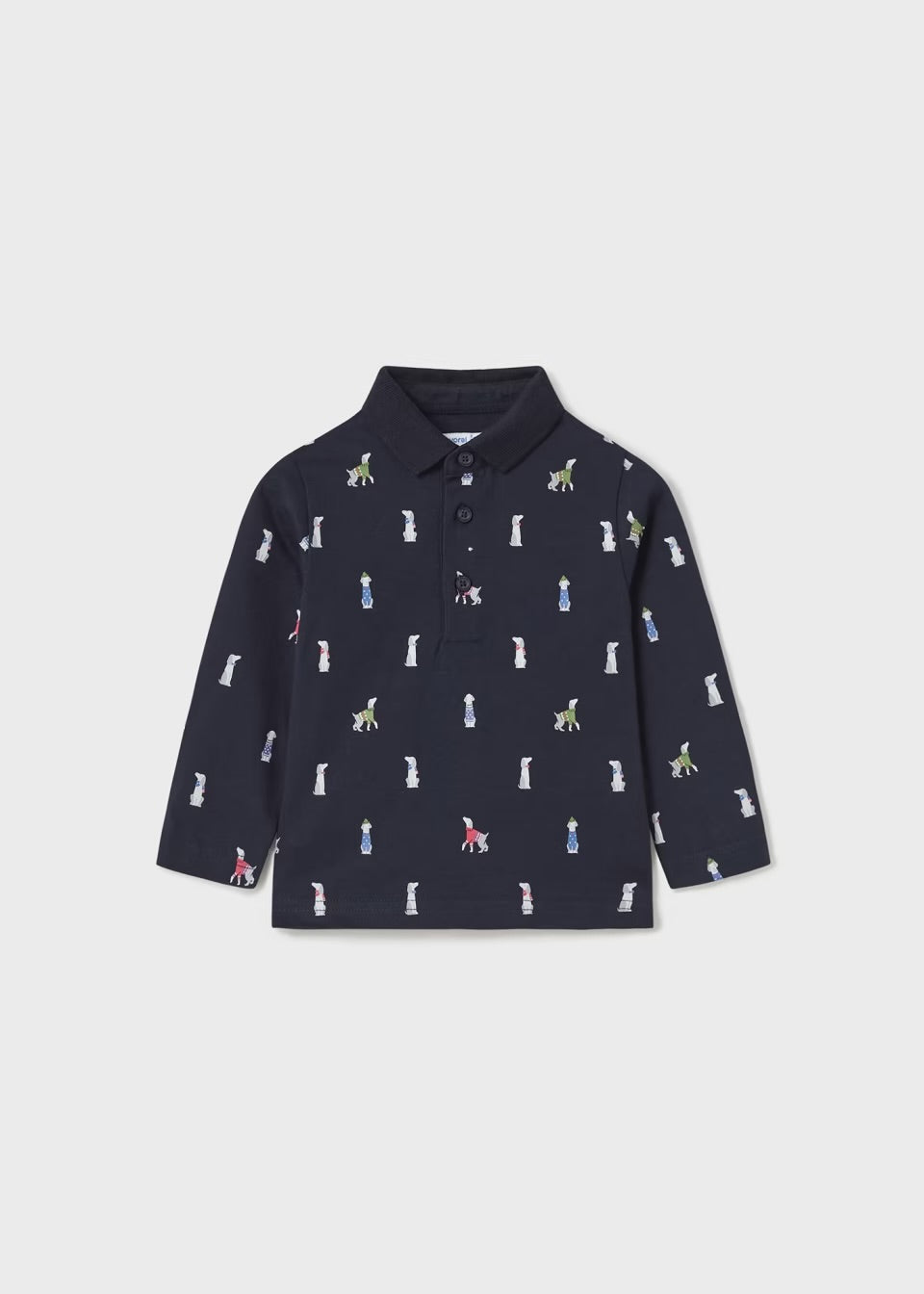 Esta es una playera tipo polo de manga larga para niño en color azul oscuro. Tiene un patrón de pequeñas ilustraciones de perros en diferentes posiciones y colores. La playera cuenta con un cuello clásico de polo y una abierta con botones al frente.