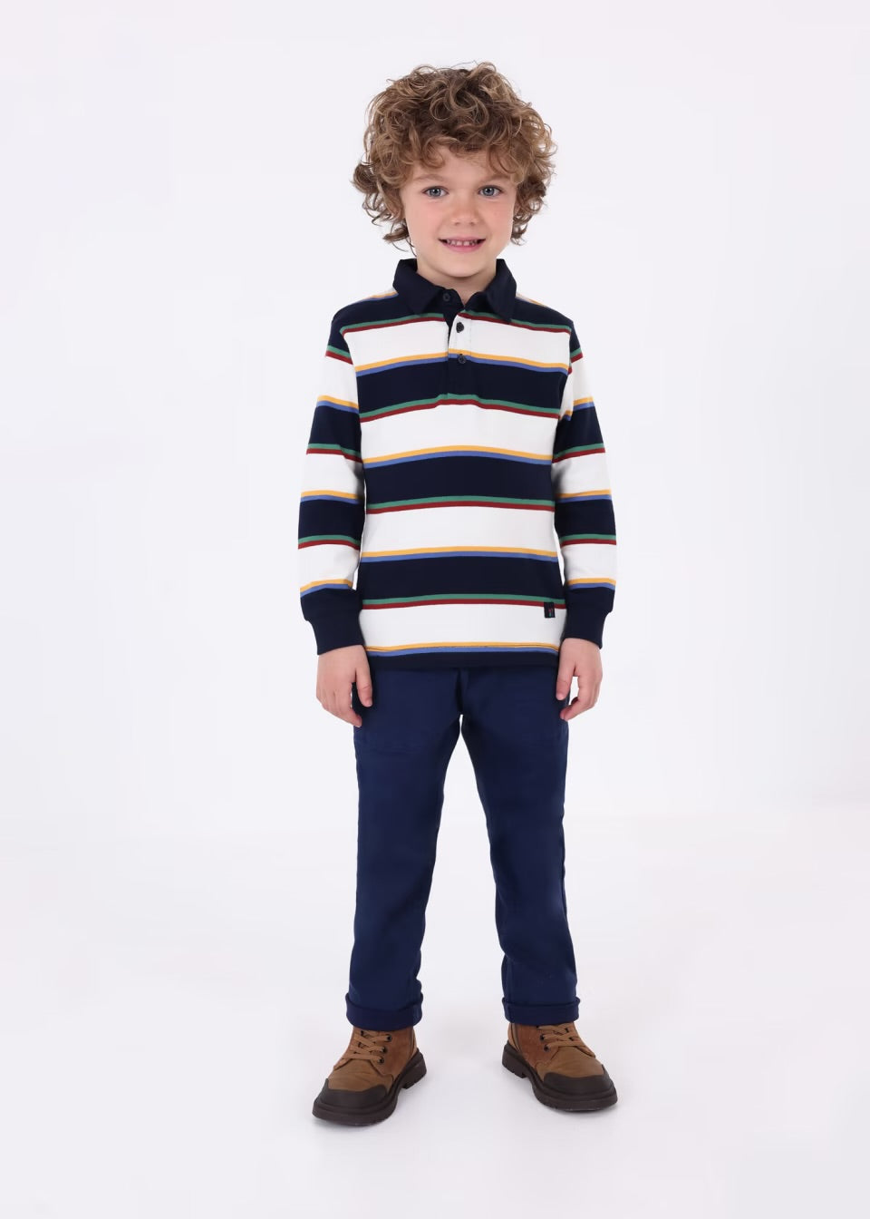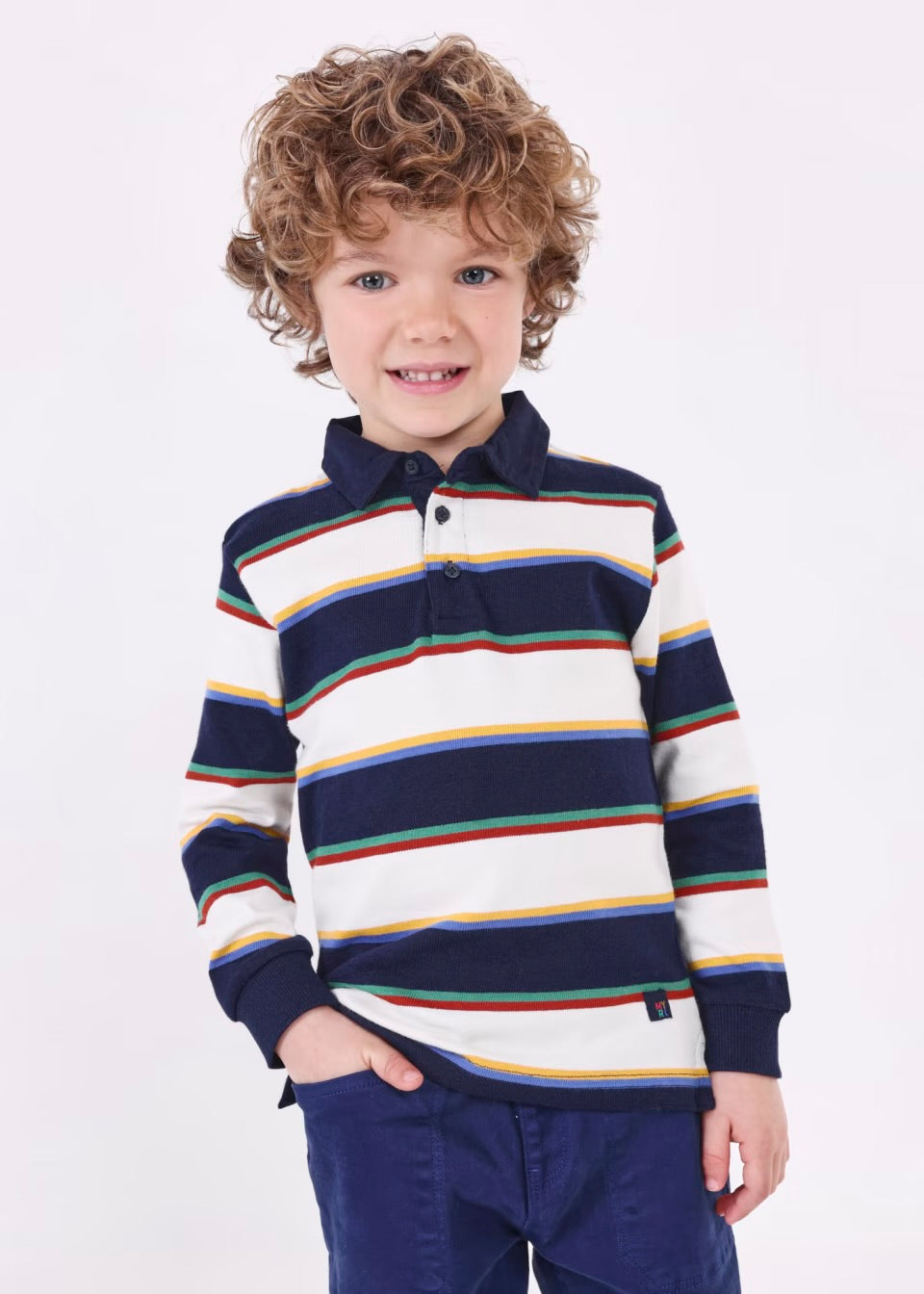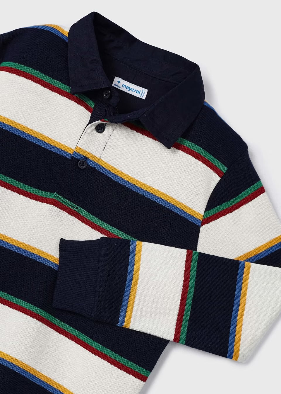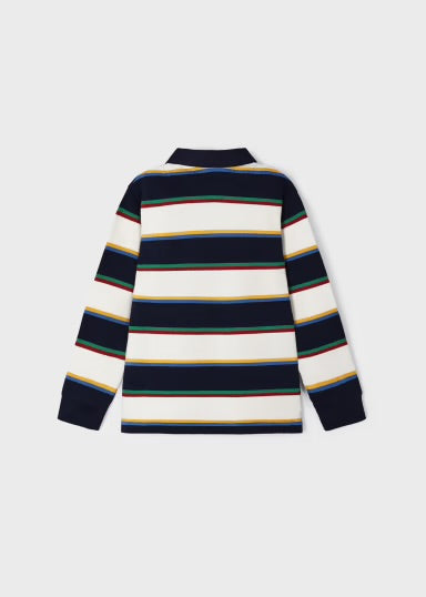 Esta es una playera tipo polo de manga larga para niño, con un diseño de rayas horizontales en colores azul marino, blanco, amarillo, verde y rojo. Tiene cuello clásico con botones en la parte delantera. Los puños ajustados le dan un toque deportivo, ideal para un look casual pero con estilo.