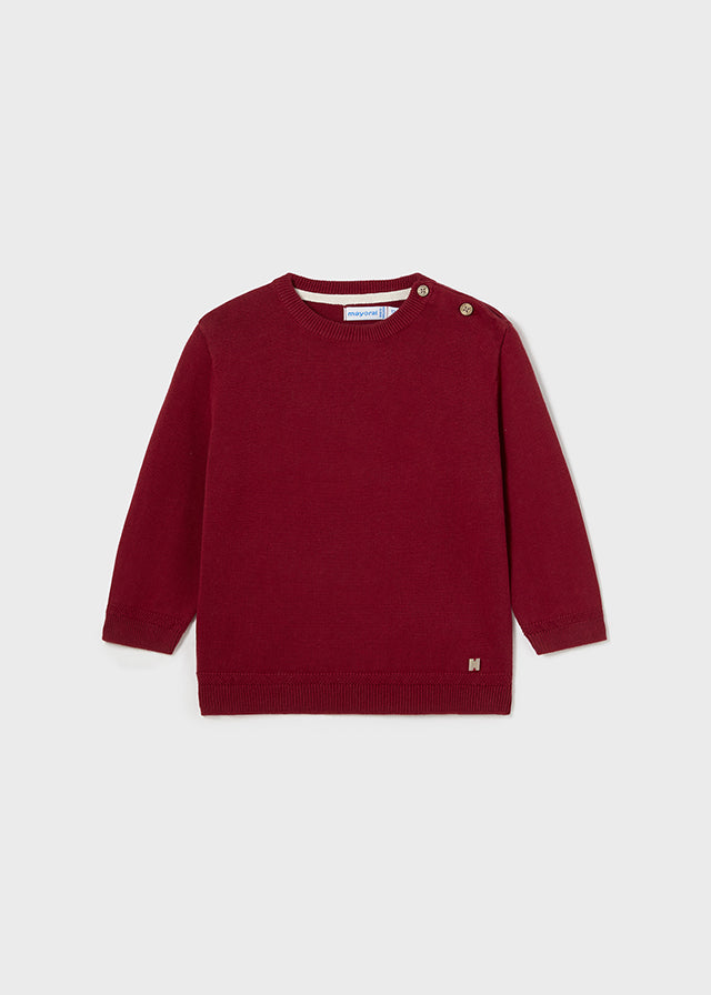 Este suéter para bebé en un tono rojo es una pieza versátil y cómoda para el armario de los más pequeños. Confeccionado en un suave tejido, proporciona calidez y confort. Su diseño clásico presenta un cuello redondo y botones en uno de los hombros, lo que facilita el vestir y desvestir.