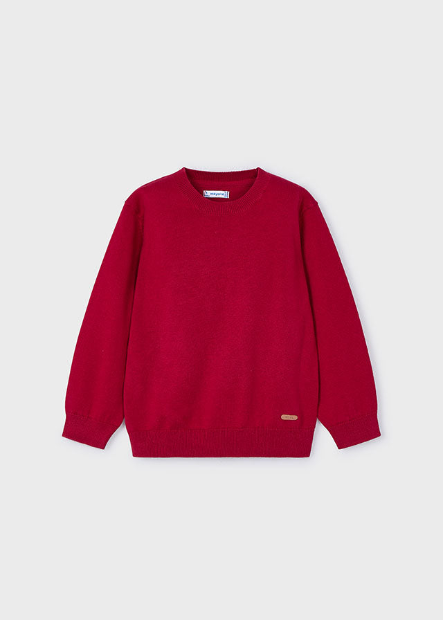 Este suéter rojo de corte clásico es una prenda básica y elegante. Con un diseño de cuello redondo y mangas largas, está confeccionado en un tejido suave que proporciona calidez y comodidad. Perfecto para un look casual o para ocasiones más formales.
