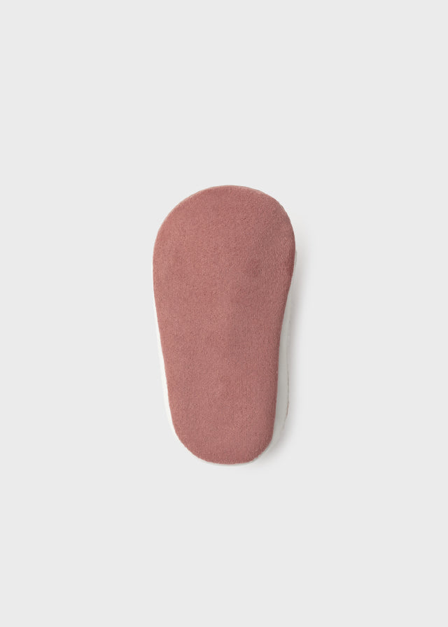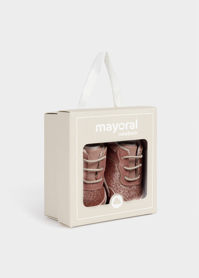 Este es un tenis para bebé en color rosa metálico con detalles brillantes. Tiene cordones decorativos en la parte superior y un diseño moderno que incluye una estrella en relieve en el costado. El interior esta forrado con un material suave lo que lo hace ideal para mantener los pies del bebé cómodos y abrigados.