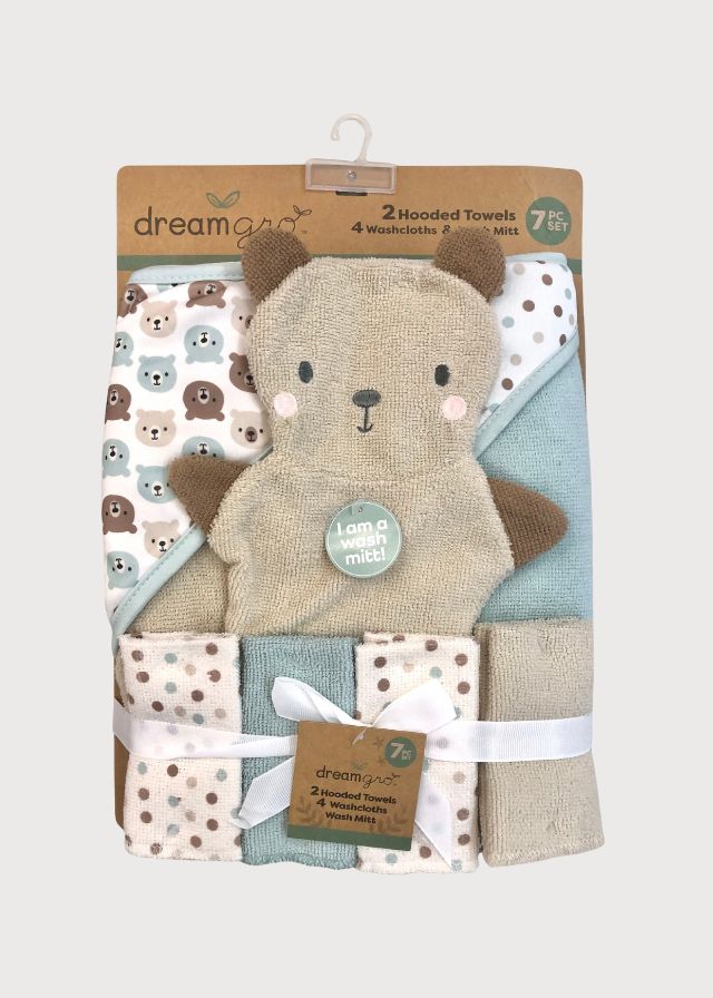 Juego de dos toallas de baño con capucha, cuatro toallitas faciales y manopla de osito