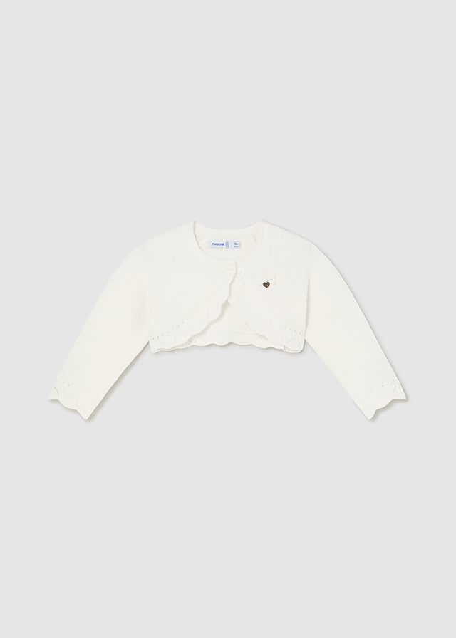 Este elegante torero para bebé es de color crudo y está confeccionado en un tejido suave y cómodo. Presenta un diseño con detalles calados que añaden un toque delicado y sofisticado. El cierre frontal cuenta con un pequeño broche decorativo. Sus mangas largas lo hacen perfecto para complementar vestidos o conjuntos, brindando un extra de abrigo y estilo en cualquier ocasión especial.
