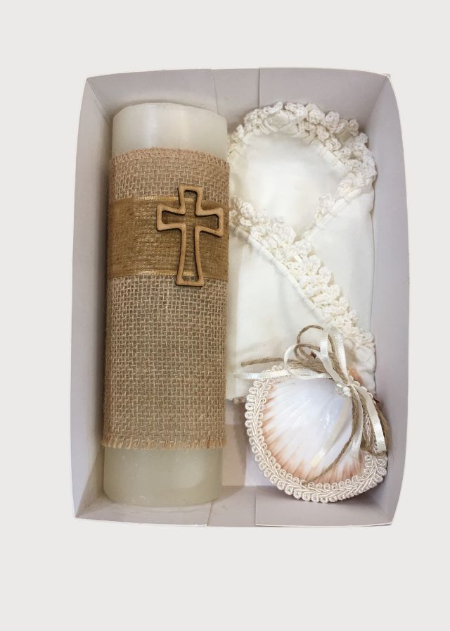 Kit de bautizo que incluye tres piezas: vela, toallita y conchita.