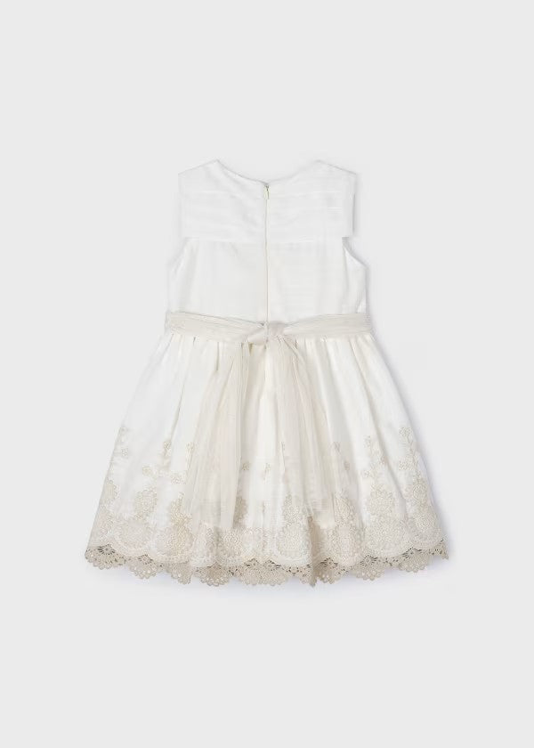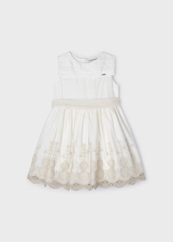 Este es un vestido para niña de estilo clásico y elegante en color crudo con detalles bordados en beige claro en la parte inferior de la falda. La parte superior del vestido es lisa con un diseño plisado en el pecho y sin mangas. La cintura está adornada con una cinta beige que realza la silueta del vestido, perfecto para ocasiones formales o celebraciones especiales.