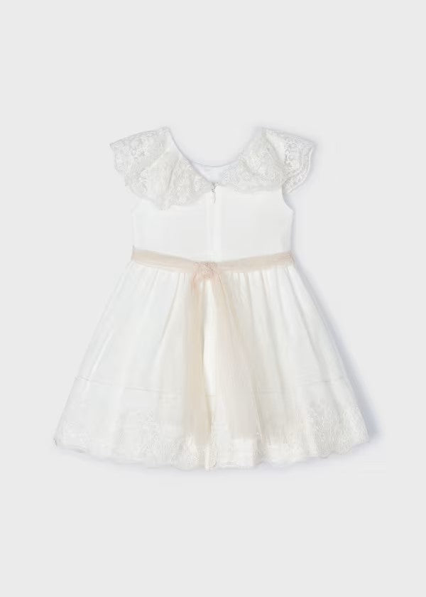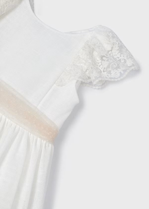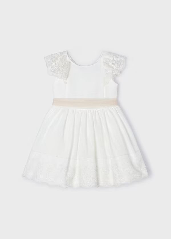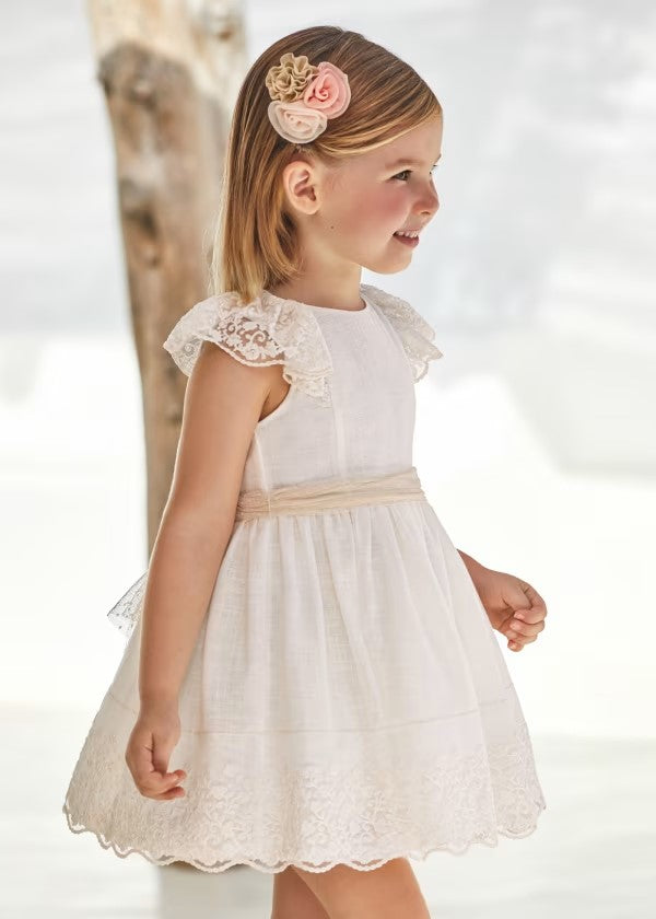 Este es un vestido elegante para niña en color crudo con detalles de encaje en las mangas. La parte superior es sencilla, mientras que la falda tiene un ligero vuelo con bordados sutiles en el borde inferior. Además, cuenta con una cinta en color beige claro que rodea la cintura, añadiendo un acento suave y elegante al diseño general del vestido.