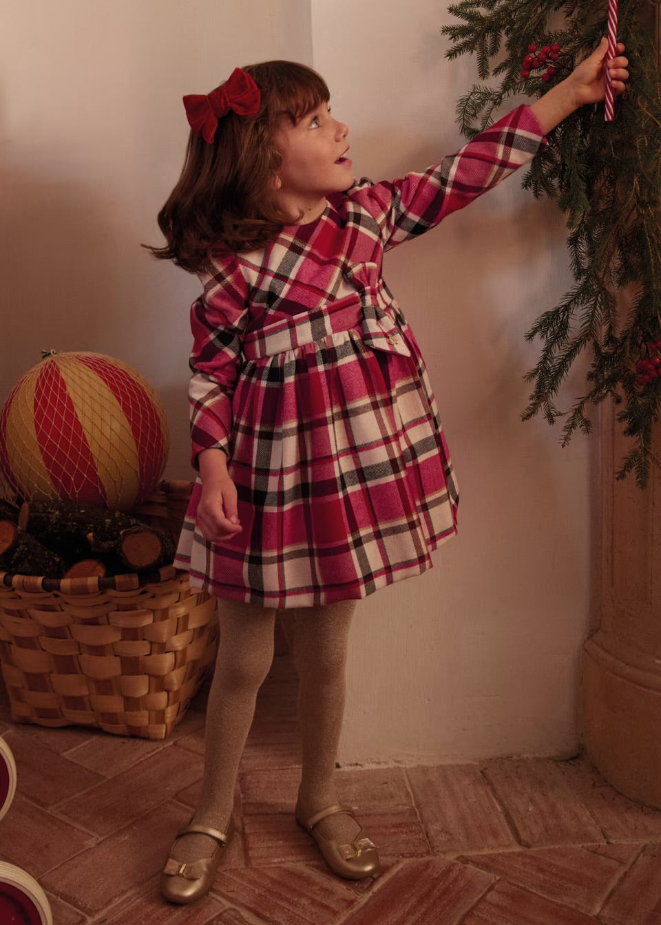 Es un vestido de manga larga para niña con un elegante diseño de cuadros en tonos rojo, blanco y marino. El vestido presenta una cintura decorada con un lazo lateral que añade un toque delicado. Su tela de textura suave y su corte clásico lo hacen perfecto para ocasiones especiales.