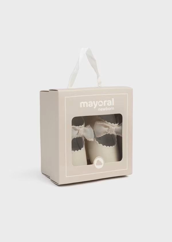 Estos son unos zapatos para bebé en color beige claro, tienen una forma tipo bailarina con bordes festoneados. En la parte superior cuentan con un moño de tela suave, lo que los hace perfectos para combinar con atuendos formales o alguna ocasión especial.