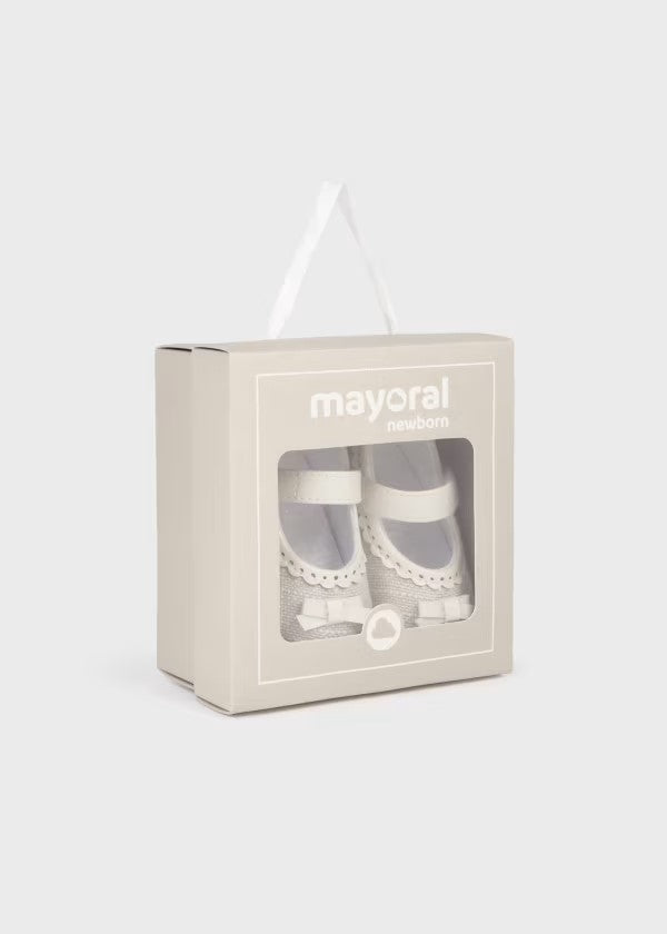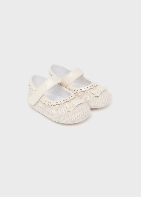 Estos son unos zapatos para bebé en color beige claro de lino, cuentan con una correa ajustable para mayor comodidad. Los bordes tienen un detalle festoneado, mientras que en la parte frontal presentan un pequeño moño decorativo.